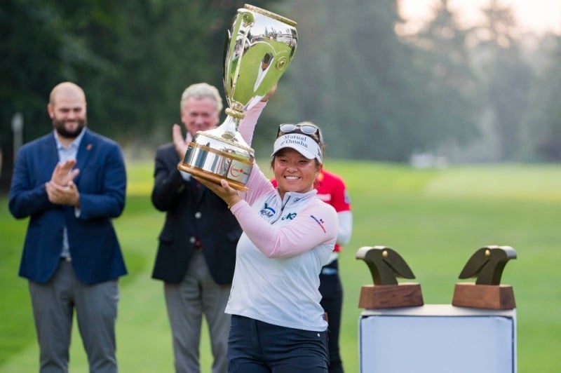 Megan Khang holds the championship trophy after the final round of the CPKC Women's Open golf tournament at Shaughnessy Golf & Country Club, Vancouver August 27, 2023. โ Picture by Bob Frid-USA TODAY Sports via Reuters Megan Khang, born on…